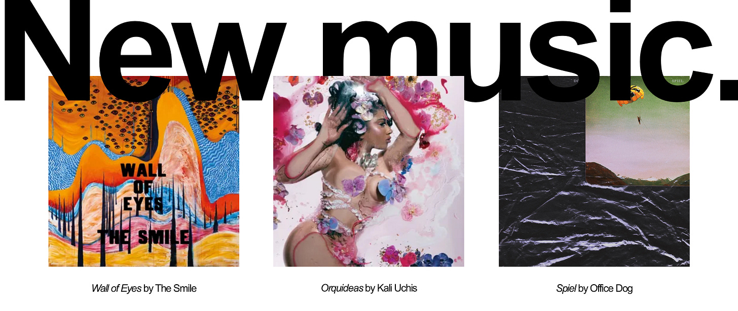 A4. New music this week: Thom Yorke, Jonny Greenwood, and Tom Skinner returned for their second full-length album as the Smile. Wall of Eyes goes deeper into the band’s subconscious, both lyrically and musically (Apple Music / Spotify). The Colombian American singer, Kali Uchis has said her fourth album “is inspired by the timeless, eerie, mystic, striking, graceful and sensual allure of the orchid,” as referenced by the Spanish-language LP’s title, Orquídeas. (Apple Music / Spotify). And on their debut album, Spiel, the Auckland, New Zealand, indie rock trio Office Dog “assembles intricate musical collages, and fearlessly explore the depths of complex emotions through layers of tension, release, and celestial lyricism” (Bandcamp / Apple Music / Spotify).